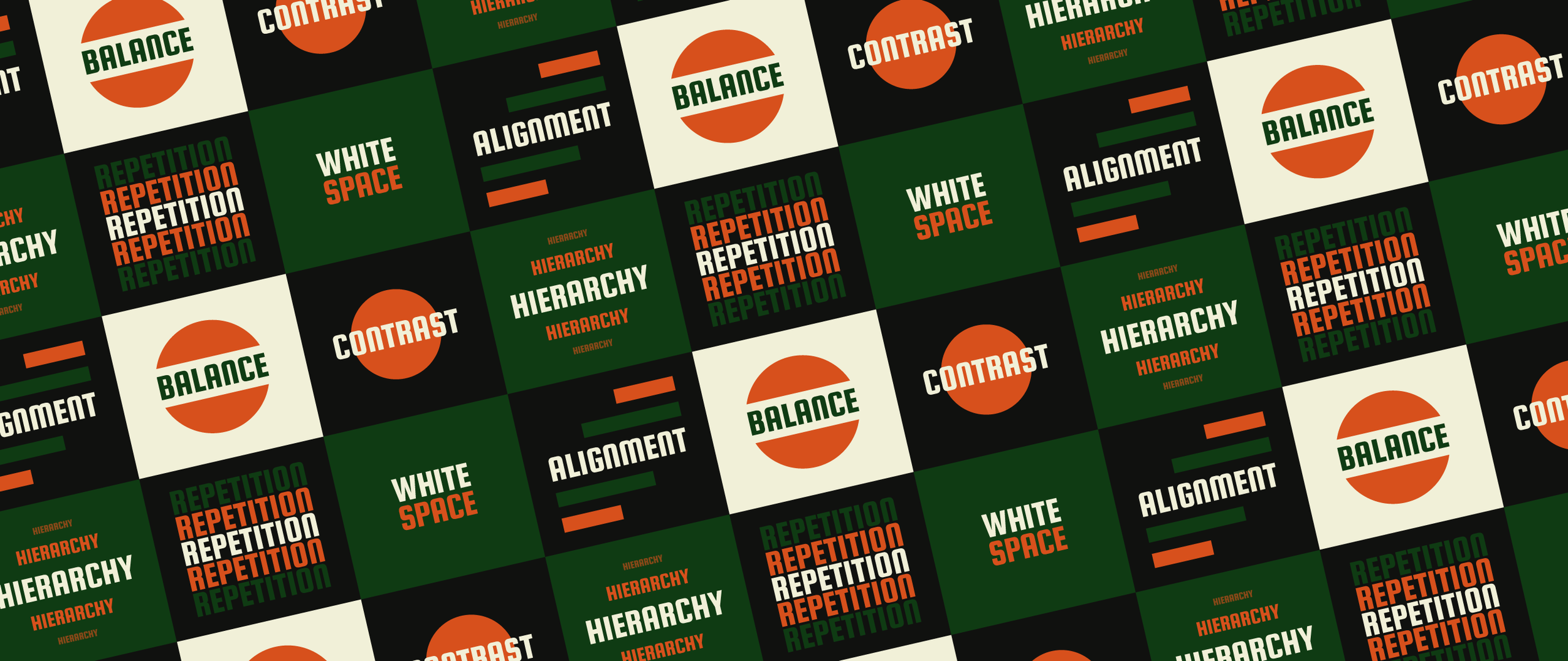 Create a series of educational slides featuring graphic representations of the six primary design principles: Alignment, Balance, Contracts, Hierarchy, Repetition and White Space.